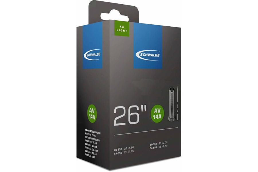 Der Schwalbe AV14A ist ein Ersatzschlauch für 26" Zoll Fahrradreifen mit Autoventil. Der Butyl-Schlauch ist XX Leicht und wiegt rund 95g.