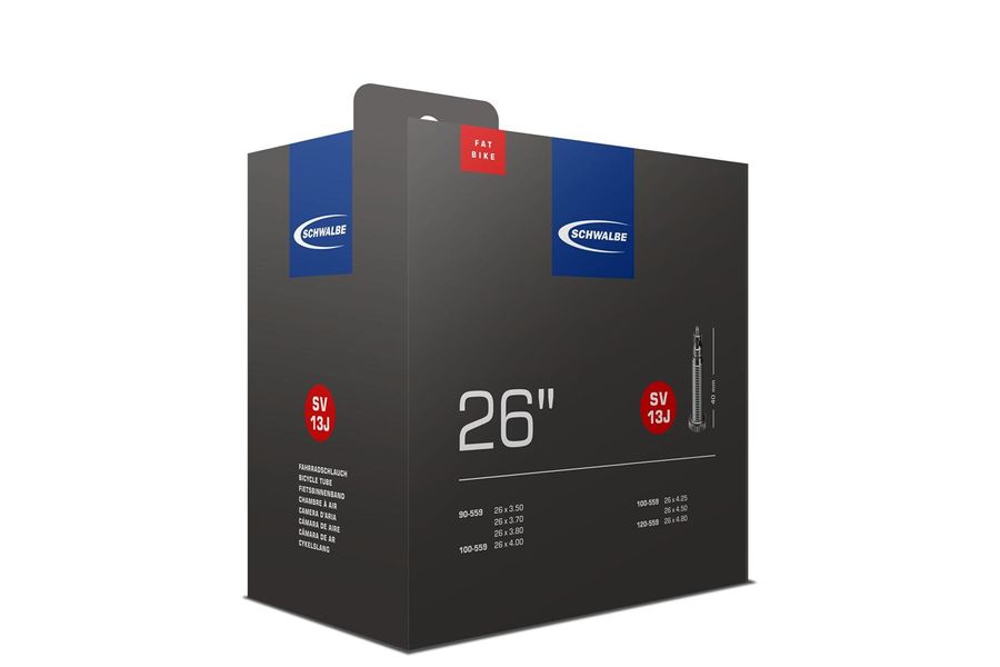 Der Schwalbe SV13J Fatbike ist ein Butyl-Ersatzschlauch mit Sclaverandventil für 26-Zoll-Fahrradreifen. Er ist passend für ETRTO 90/120-559, wiegt 390 g und überzeugt durch seine Zuverlässigkeit.