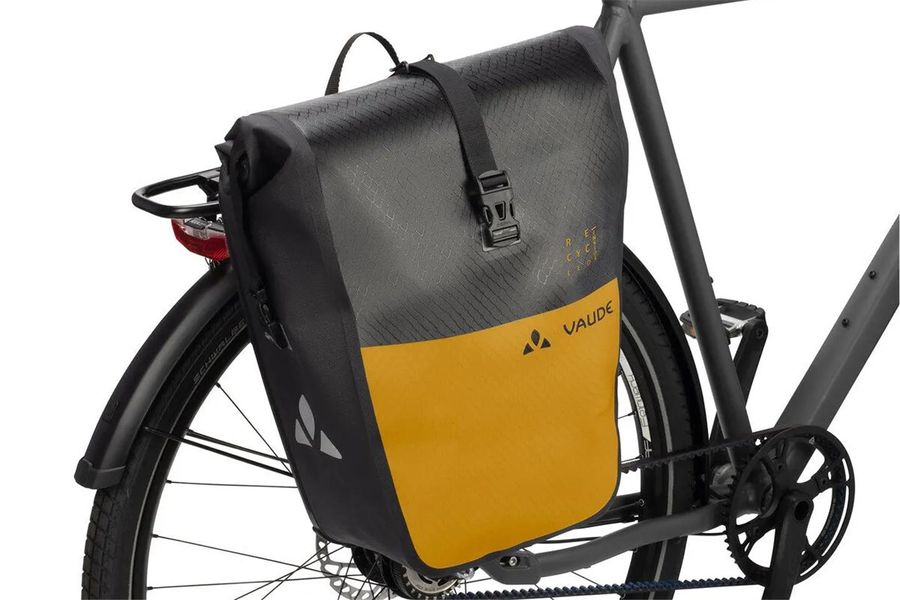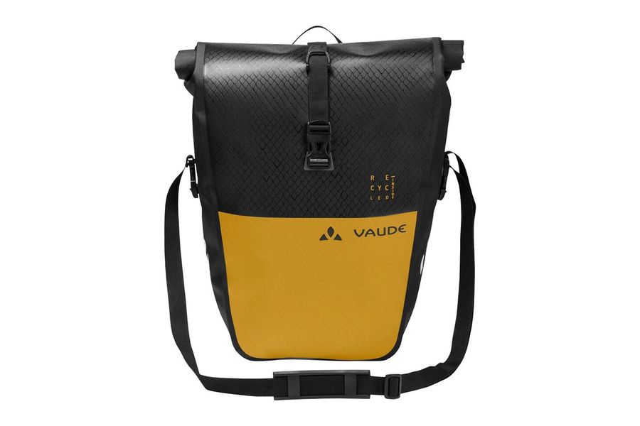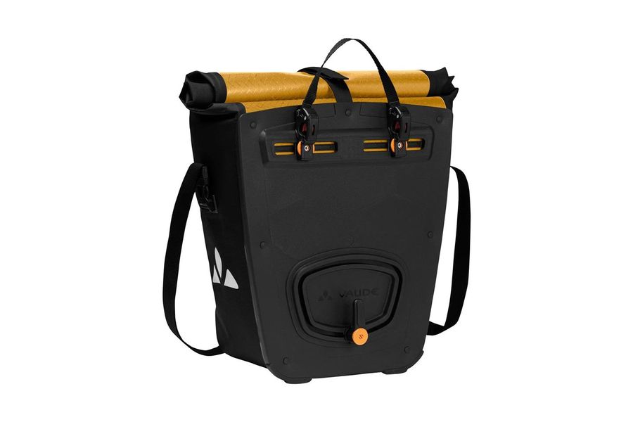 Fahradpendler*innen und Radreisende werden die Fahrradtasche für das Hinterrad lieben! Die wasserdichte Hinterradtasche wird aus recycelten Materialien am deutschen VAUDE Standort in der Nähe des Bodensees hergestellt. Sie lässt sich durch den Wickelverschluss auf die benötigte Größe komprimieren und absolut dicht verschließen. Für sichere Aufbewahrung von Kleinteilen oder Dokumenten sorgt eine integrierte Organizer-Innentasche mit Reißverschluss. Die einzelne Fahrradtasche für das Hinterrad ist mit einer stabilen Rückenplatte ausgestattet und wird mit dem QMR 2.0-System stabil rechts oder links am Gepäckträger befestigt. Die Haken sind über einfach bedienbare Handrädchen justierbar. Mit einem kleinen Bügelschloss (z. B. TSA-Schloss II) kann sie direkt am QMR-Haken verriegelt werden. Mit Reflexelementen bedruckt. Lieferumfang: eine einzelne Fahrradtasche mit 24 l Volumen, die auf jedem Gepäckträger mit runden Rohren (bis 16 mm Durchmesser) befestigt werden kann. Die Aqua Back Single kann um diese praktischen Zubehör-Taschen ergänzt werden: Sortyour Back, Sortyour Business und Addita Bag. Der abnehmbare Tragegurt ermöglicht ein bequemes Tragen über der Schulter. Die Tasche ist mit Eco Finish umweltfreundlich wasserabweisend ohne Fluorcarbone (PFC) ausgerüstet. Das VAUDE Green Shape-Label steht für ein umweltfreundliches, funktionelles Produkt aus nachhaltigen Materialien.