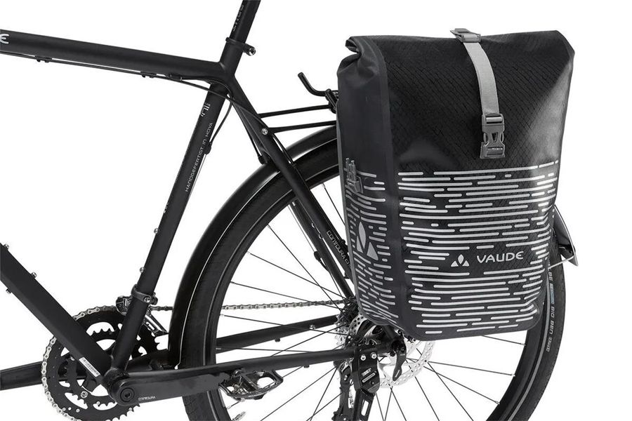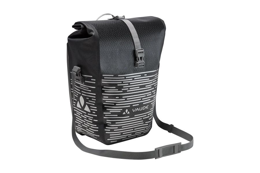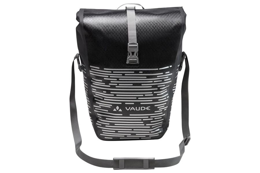 Für Pendler, die auch im Dunkeln unterwegs sind! Die wasserdichte Hinterrradtasche mit großem, stark reflektierenden Druck wird aus robustem, PVC-freiem Planen-Material am deutschen VAUDE-Standort in der Nähe des Bodensees im Hochfrequenz-Schweißverfahren hergestellt. Sie lässt sich durch den Wickelverschluss auf individuelle Größen bringen und absolut dicht verschließen. Für Übersichtlichkeit sorgt eine Innentasche mit kleinen, aufgesetzten Reißverschluss-Netztaschen. Die Radtasche wird mit dem QMR 2.0-System und stabiler Rückenplatte am hinteren Gepäckträger befestigt. Ein Zug am die beiden Haken verbindenden Band öffnet das System komfortabel. Das mit einem kleinen Schloss (z. B. TSA Schloss, nicht im Lieferumfang enthalten) absperrbare System ist einfach über Handrädchen justierbar und wird durch den flexibel einstellbaren, unteren Rail Hook komplettiert. Ein praktischer Schultergurt erleichtert den Transport zu Fuß. Für Pendler, die auch in Dämmerung und Dunkelheit unterwegs sind, ist diese stark reflektierende Radtasche ein Must have für den täglichen Weg zur Arbeit. Die Aqua Back Luminum Radtasche kann durch diese praktischen Accessoires ergänzt werden: Sortyour Business, Sortyour Back, Addita Bag.