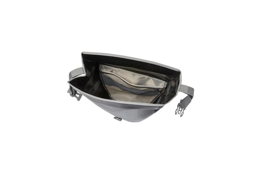 Die wasserdichte Hinterrradtasche mit großem, stark reflektierenden Druck lässt sich durch den Wickelverschluss auf individuelle Größen bringen und absolut dicht verschließen. Für Übersichtlichkeit sorgt eine Innentasche mit kleinen, aufgesetzten Reißverschluss-Netztaschen. Die Radtasche wird mit dem QMR 2.0-System und stabiler Rückenplatte am hinteren Gepäckträger befestigt.