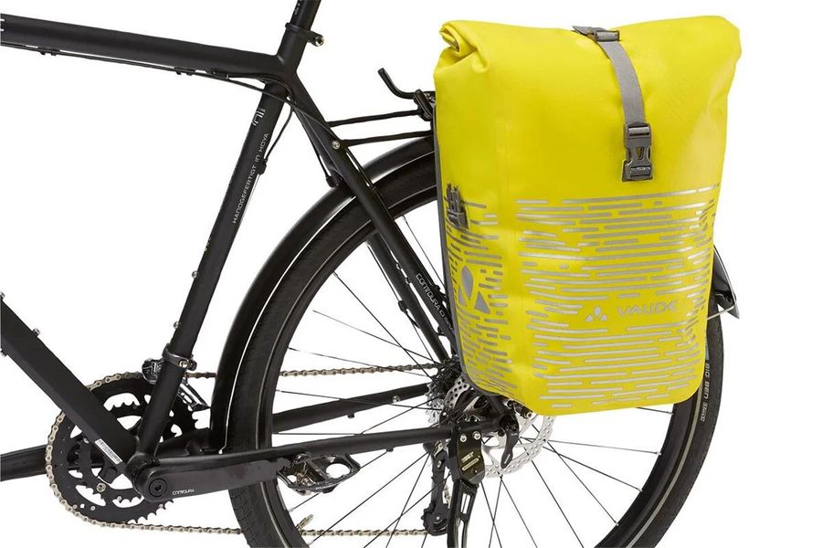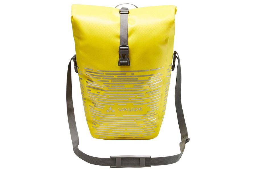 Für Pendler, die auch im Dunkeln unterwegs sind! Die wasserdichte Hinterrradtasche mit großem, stark reflektierenden Druck wird aus robustem, PVC-freiem Planen-Material am deutschen VAUDE-Standort in der Nähe des Bodensees im Hochfrequenz-Schweißverfahren hergestellt. Sie lässt sich durch den Wickelverschluss auf individuelle Größen bringen und absolut dicht verschließen. Für Übersichtlichkeit sorgt eine Innentasche mit kleinen, aufgesetzten Reißverschluss-Netztaschen. Die Radtasche wird mit dem QMR 2.0-System und stabiler Rückenplatte am hinteren Gepäckträger befestigt. Ein Zug am die beiden Haken verbindenden Band öffnet das System komfortabel. Das mit einem kleinen Schloss (z. B. TSA Schloss, nicht im Lieferumfang enthalten) absperrbare System ist einfach über Handrädchen justierbar und wird durch den flexibel einstellbaren, unteren Rail Hook komplettiert. Ein praktischer Schultergurt erleichtert den Transport zu Fuß. Für Pendler, die auch in Dämmerung und Dunkelheit unterwegs sind, ist diese stark reflektierende Radtasche ein Must have für den täglichen Weg zur Arbeit. Die Aqua Back Luminum Radtasche kann durch diese praktischen Accessoires ergänzt werden: Sortyour Business, Sortyour Back, Addita Bag.