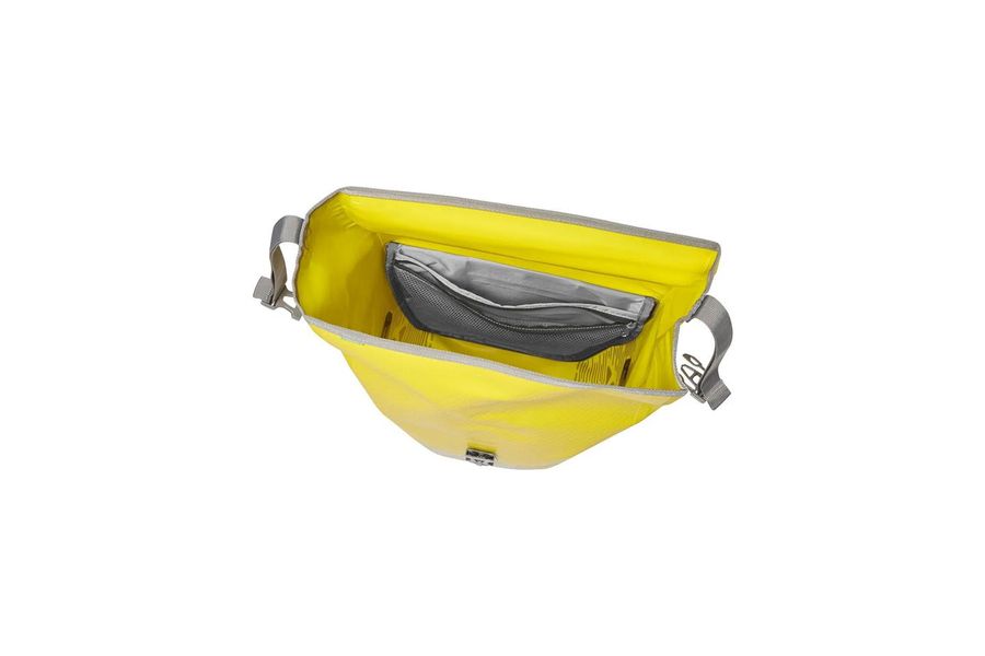 Die wasserdichte Hinterrradtasche mit großem, stark reflektierenden Druck lässt sich durch den Wickelverschluss auf individuelle Größen bringen und absolut dicht verschließen. Für Übersichtlichkeit sorgt eine Innentasche mit kleinen, aufgesetzten Reißverschluss-Netztaschen. Die Radtasche wird mit dem QMR 2.0-System und stabiler Rückenplatte am hinteren Gepäckträger befestigt.