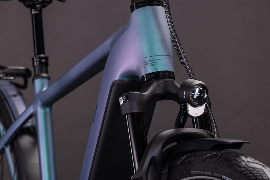 The CUBE Kathmandu Hybrid's design is classically elegant – familiar, even – but it's stuffed full of innovation and clever touches. The neatly housed Bosch CX drive and 800Wh PowerTube battery are just the start. Efficient Comfort Geometry is designed around a 100mm travel suspension fork, for better control even when the going gets rough. Integrated cables complement the frame's clean lines, while a UDH dropout is tough, versatile and future-proof. And, of course, there's an integrated chain guard mount and the tough, sturdy and exceptionally neat Integrated Carrier 3.0, so you can carry everything you need for your adventures.