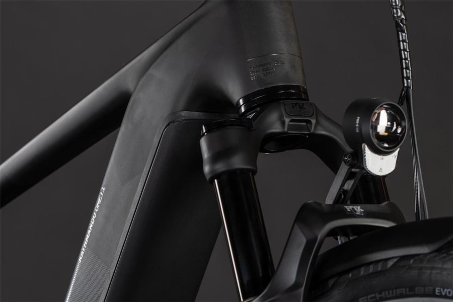 The CUBE Kathmandu Hybrid ONE11 HPC SLT is all about zero compromise, for the ultimate in touring comfort and practicality. The sophisticated full-suspension frame – with Fox 34 Float AWL fork and Float Performance shock – is just the start. There's an adjustable stem and a dropper seatpost. Shimano's peerless XT Di2 1x12 electronic gears deliver up to 100Nm of torque from the Bosch CX drive and 800Wh battery to the road. Schwalbe's smooth, comfortable 55mm Marathon Efficiency Evo tyres roll on a Newmen Performance 30 wheelset, while the powerful Magura Gustav Pro hydraulic disc brakeset is equipped with ABS, just like your car. Fully equipped with IC 3.0 rear carrier, mudguards and lights, CUBE even added a Bosch Connect Module for GPS tracking. It's ready to take on the world.