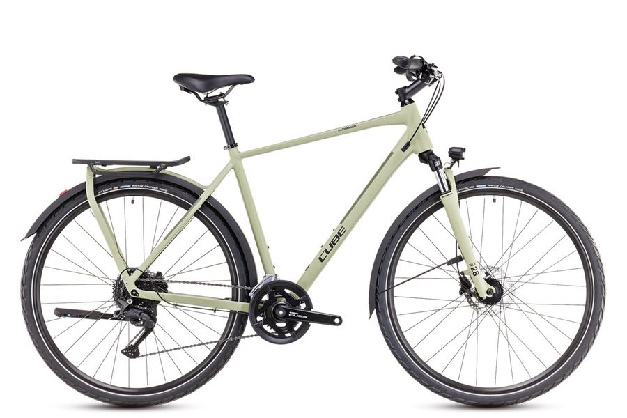 You won't know how versatile a bike can really be until you've sat on a Kathmandu ONE! Designed for long trekking adventures, it comes with a torsion-resistant integrated pannier rack that gets all your cargo safely from A to B, whether you're on the way to the office or on a multi-day tour. With the brand new, easy-to-use Cues 2x9-speed gears from Shimano, you can shift reliably and safely from gear to gear. Powerful hydraulic disc brakes ensure safe braking manoeuvres, even in wet conditions. Speaking of wet conditions: CUBE has equipped the bike with a kickstand, lights and mudguards. On top of that, there's a comfortable suspension fork that swallows up bumps and holes on the trail like nothing. So, where do you want to go on your next tour?