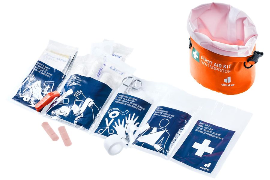 The Deuter Waterproof First Aid Kit, made from durable, waterproof (IPX4) material, contains the basic medical supplies needed for common injuries sustained during outdoor activities or water sports.