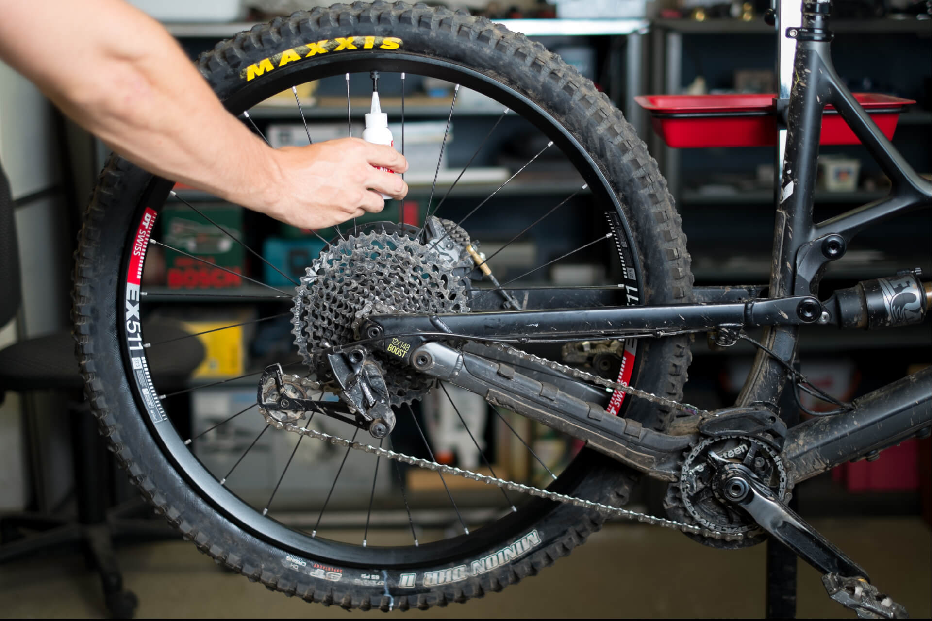 To avoid the infamous sour mess with tubeless milk, use either the small filler bottles or the filler syringe, e.g. from Stan’s Notubes. Start with the valve at 12 o’clock, then turn the wheel down with the valve at 6 o’clock and fill in the milk. Finally, screw the valve insert back in and inflate the tyre to the desired pressure.