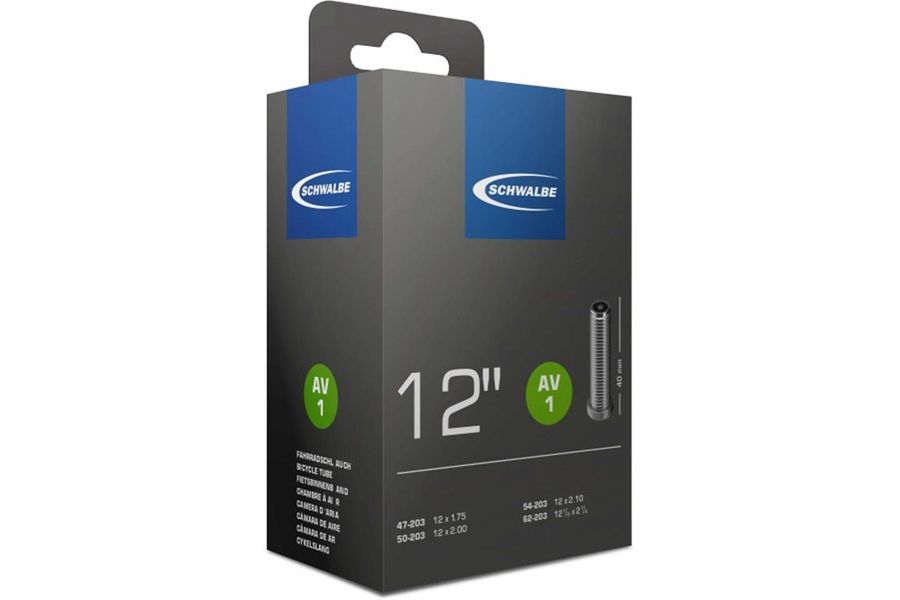 The Schwalbe AV1 is a replacement inner tube for 12 inch bicycle tyres with car valve. The butyl inner tube is robust and weighs around 80g.