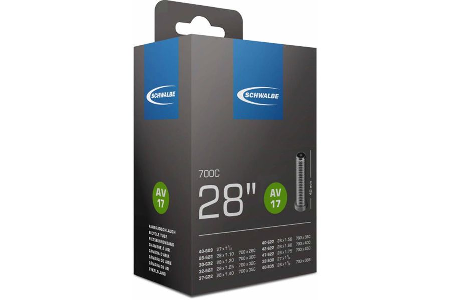 The Schwalbe AV17 is a replacement inner tube for 28 inch (700c) bicycle tyres with Schrader valve. The butyl inner tube is robust and weighs around 150g.