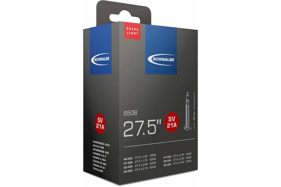 The Schwalbe SV21A is a replacement tube for 27.5" inch (650B) bicycle tires with Sclaverand valve. The tube is robust and weighs around 135g.