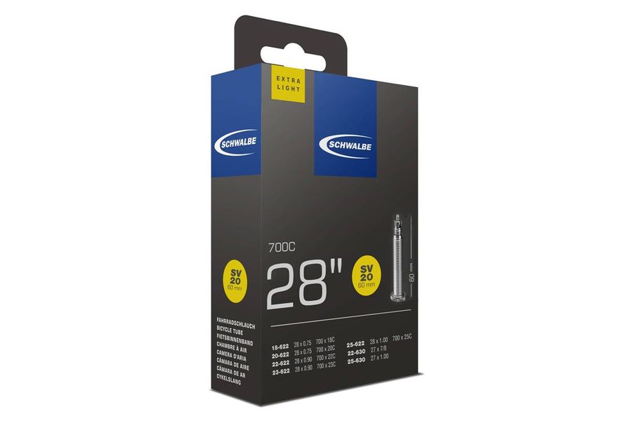 The Schwalbe SV20 is a lightweight replacement inner tube for 28 inch bicycle tyres with Sclaverand valve. The butyl tube is robust and weighs around 65g. Lower weight, with the same reliability as a Schwalbe standard inner tube.