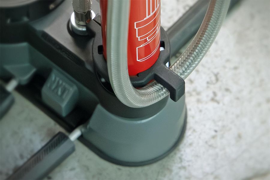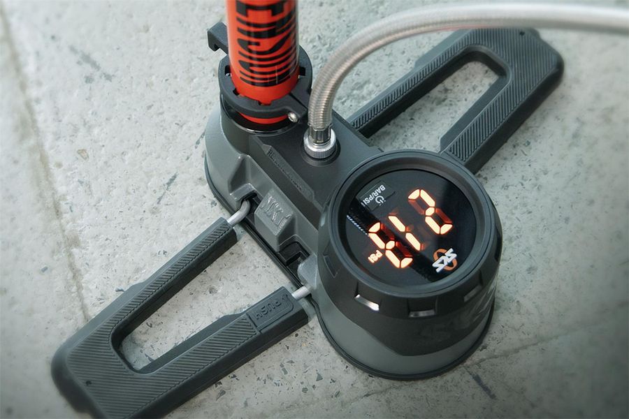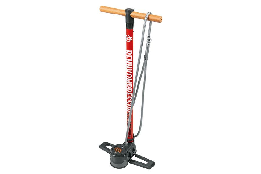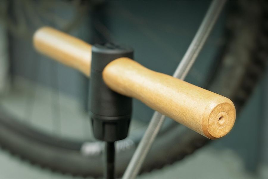 Stands out, but doesn't fall over: the high-pressure hose pump with its striking red metal tube is impossible to miss, and a non-slip cast aluminum base ensures stability. The extra-long, rubberized steel flex hose offers plenty of freedom of movement, especially when the bike is hanging in the assembly stand. Particularly practical: folding feet and the removable wooden handle allow the shock pump to be stored in the workshop in a space-saving manner.