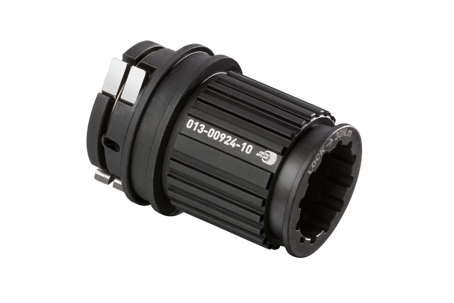 The freewheel body allows a 12-speed Shimano Micro-Spline cassette to be mounted on compatible Tacx direct drive trainers with a 12 mm rear axle.
