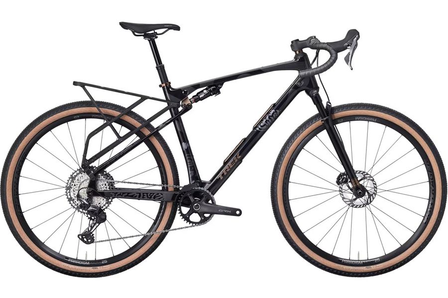 The CheckOUT SL 5 is an adventure-ready full-suspension gravel bike for epic rides through the backcountry. The RockShox SIDluxe IsoStrut shock in the carbon frame offers 55 mm of rear travel, while a RockShox Rudy XL 60 mm suspension fork smooths out bumpy roads and trails. With Bontrager Paradigm Comp wheels, Shimano GRX 12-speed shifting and TranzX Vario seat post, it's ready for adventure right out of the box.