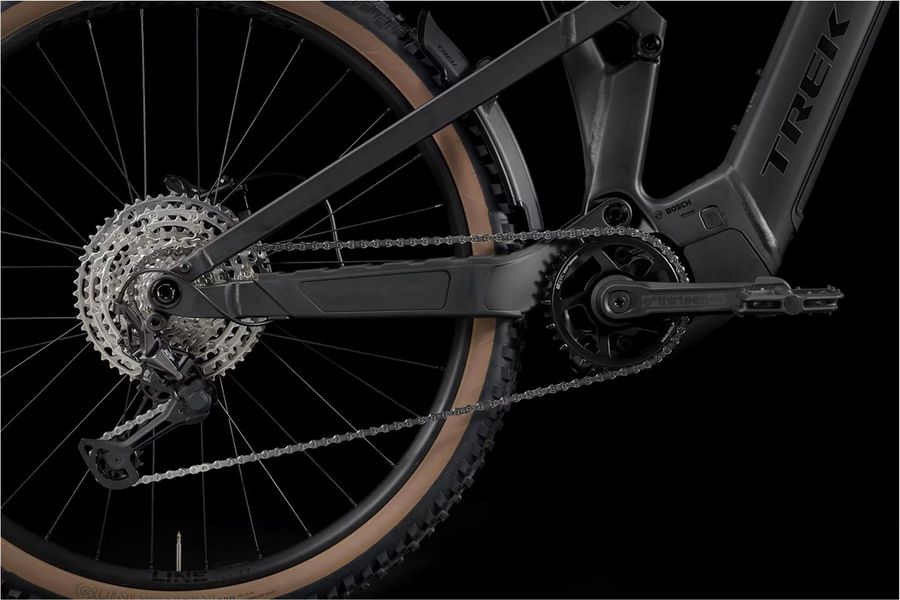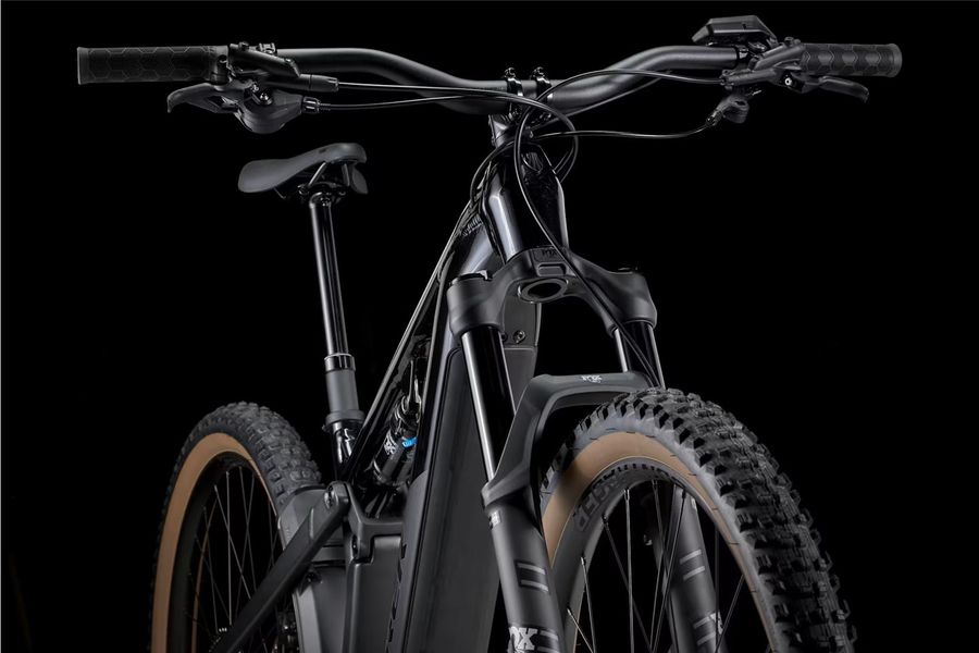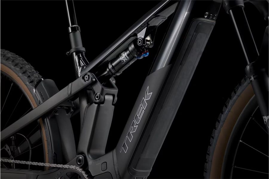 The Powerfly+ FS 6 is a powerful, full-suspension e-mountainbike for long laps off the beaten track. Trails are defused by a chassis with 130 mm front and 120 mm rear suspension travel, and the powerful Bosch Performance Line motor with removable, integrated RIB 2.0 battery, which is compatible with a Bosch PowerMore additional battery, takes you a long way. An Alpha Platinum Aluminium frame with a Bosch Performance Line drive system with 250 W power and 85 Nm torque, including a removable, integrated PowerTube RIB 2.0 battery with a massive 800 Wh capacity and Purion 200 controller. A FOX Float AWL fork with 130 mm travel, air suspension and RAIL 2.0 damping as well as a FOX Float Rhythm rear shock with 120 mm travel. Tubeless-ready wheels with puncture-proof 2.4" tyres, a Shimano SLX 12-speed drivetrain for smooth gear changes, a Bontrager Line dropper post and hydraulic disc brakes.